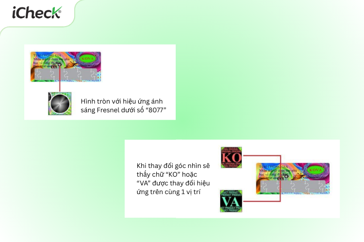 Bạn có thể kiểm tra bằng mắt thường và thay đổi góc nhìn để nhận biết các yếu tố bảo mật được in trên tem chống giả KOVA mới: